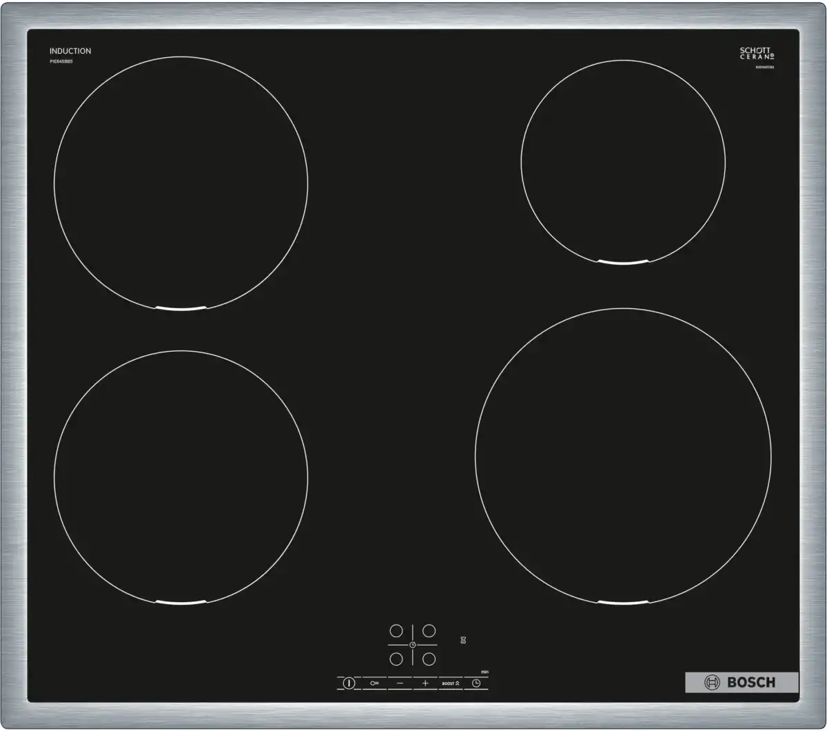 Εντοιχιζόμενη εστία κουζίνας PIE645BB5E από τον κατασκευαστή Bosch, με 4 ζώνες μαγειρέματος. Ο τύπος της είναι επαγωγική, θερμαίνεται δηλαδή μόνο το κάτω μέρος από το σκεύος και όχι όλη η εστία, με αποτέλεσμα η περιβάλλουσα περιοχή να παραμένει κρύα στην αφή.