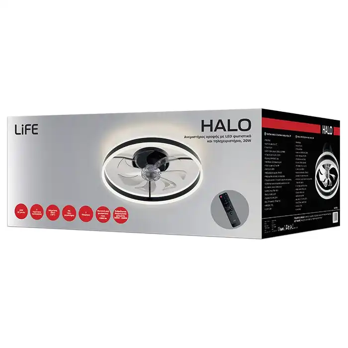 - Δροσίστε τον χώρο σας με τον ανεμιστήρα οροφής LIFE HALO, έναν ανεμιστήρα με ξεχωριστό minimal design και LED φωτιστικό, αλλά και με ισχυρό και αθόρυβο DC μοτέρ 20W.