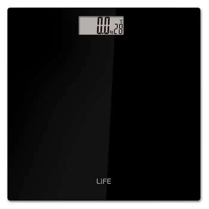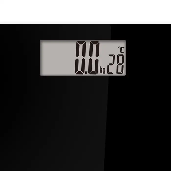Γυάλινη ηλεκτρονική ζυγαριά με ένδειξη θερμοκρασίας χώρου, ψηφιακή οθόνη LCD με μεγάλα και ευανάγνωστα λευκά LED ψηφία.