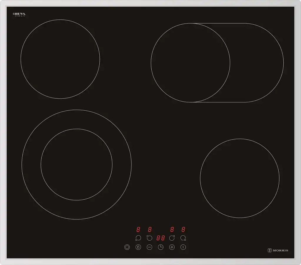 6 ζώνες μαγειρέματος = 2 μονές 14.5 εκ (1200W) / 1 διπλή 14,5/25×14,5 εκ (1100/2000W) / 1 διπλή 12/21εκ (1100/2200W)