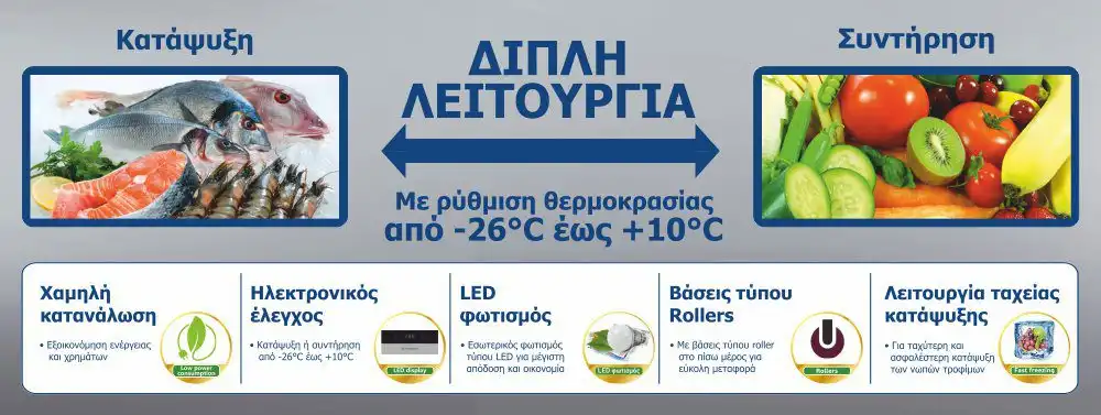 Δυνατότητα ρύθμισης θερμοκρασίας από -26°C έως -14°C στην κατάψυξη και από 0°C έως 10°C στην συντήρηση.